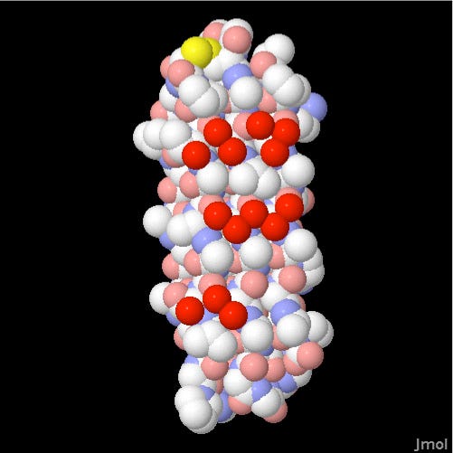 Antifreeze proteins bind to ice crystals, blocking the surface and preventing growth of the crystal. The structure of snow flea antifreeze protein (2pne ) will give you an idea of what this recognition may be like. In the crystal structure, the ice-binding surface of the protein is covered with strings of water molecules (shown here in red). These water molecules are spaced similarly to the water molecules in ice crystals. So you can imagine this protein binding to the geometric lattice of water molecules in ice in a similar way. Click on the image to view an interactive Jmol version.
